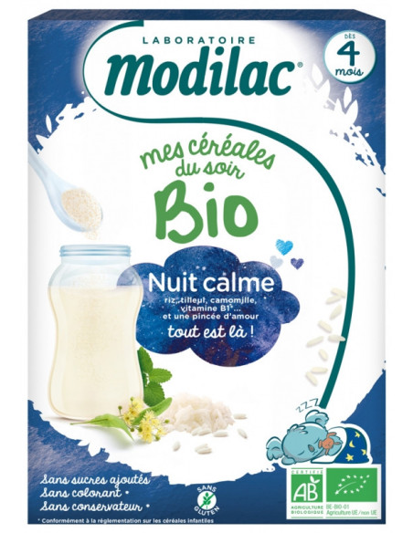 Modilac Mes Céréales du Soir Bio Dès 4 Mois Nuit Calme 250 g sont des céréales infantiles à base de riz, tilleul, camomille, vitamine B1 et une pincée d'amour qui permettent au bébé de découvrir de nouvelles saveurs et textures. Les céréales sont source d'énergie et apportent fibres, vitamines et minéraux. Sans gluten. Sans sucres ajoutés. Sans colorant, ni conservateur, conformément à la réglementation sur les céréales infantiles.