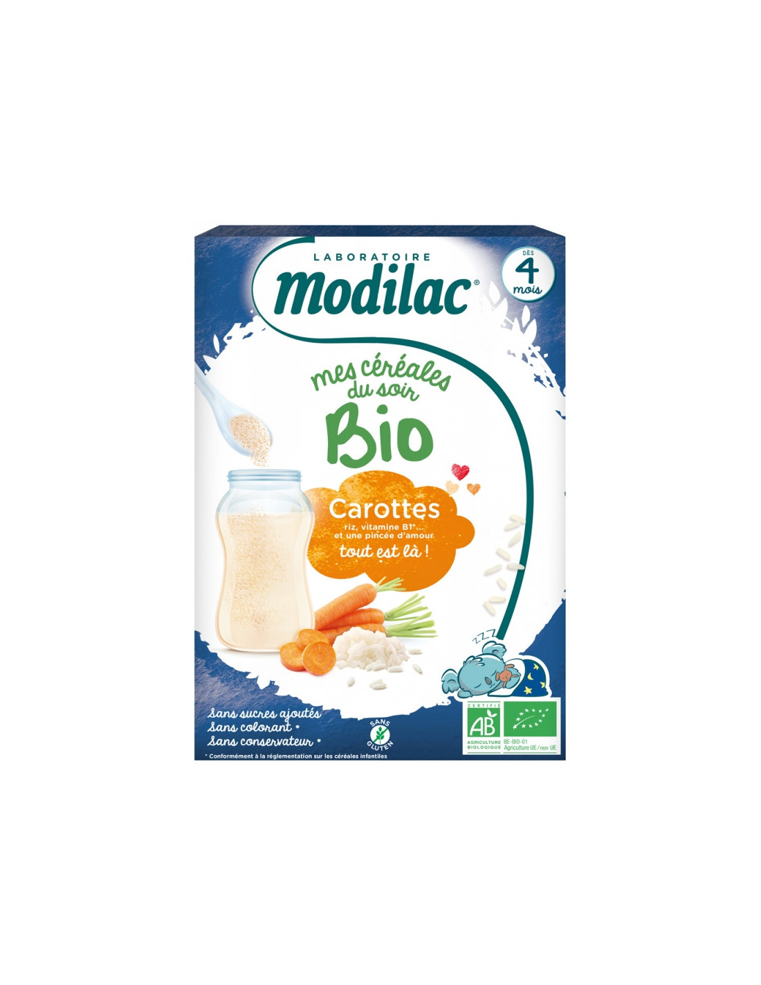 Modilac Mes Céréales du Soir Bio Dès 4 Mois Carottes 250 g sont des céréales infantiles à base de carottes, riz, vitamine B1 et une pincée d'amour qui permettent au bébé dès 4 mois de découvrir de nouvelles saveurs et textures.