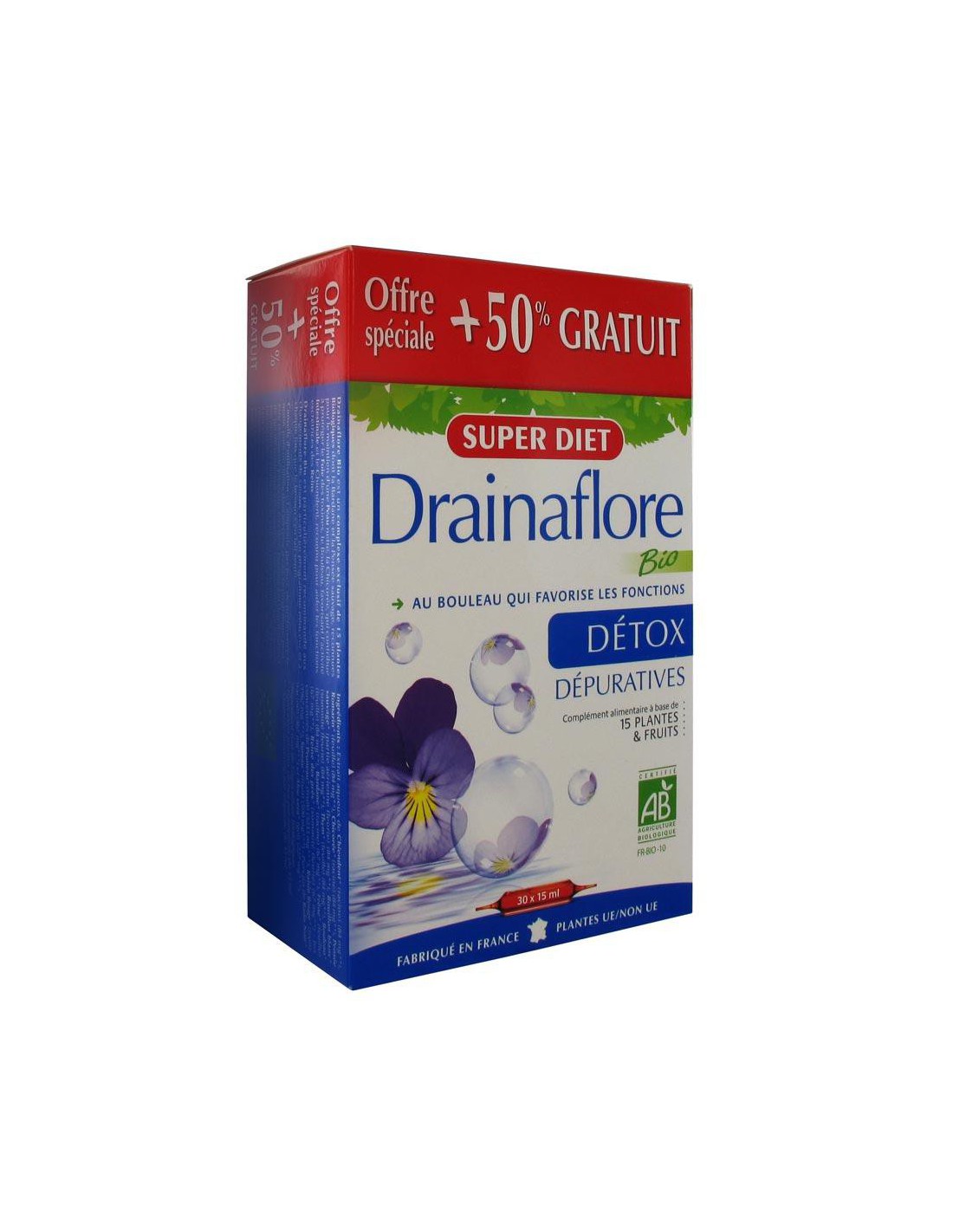 Drainaflore Bio des laboratoires Super Diet est un complément alimentaire à base de 15 plantes et fruits d'origine biologique.