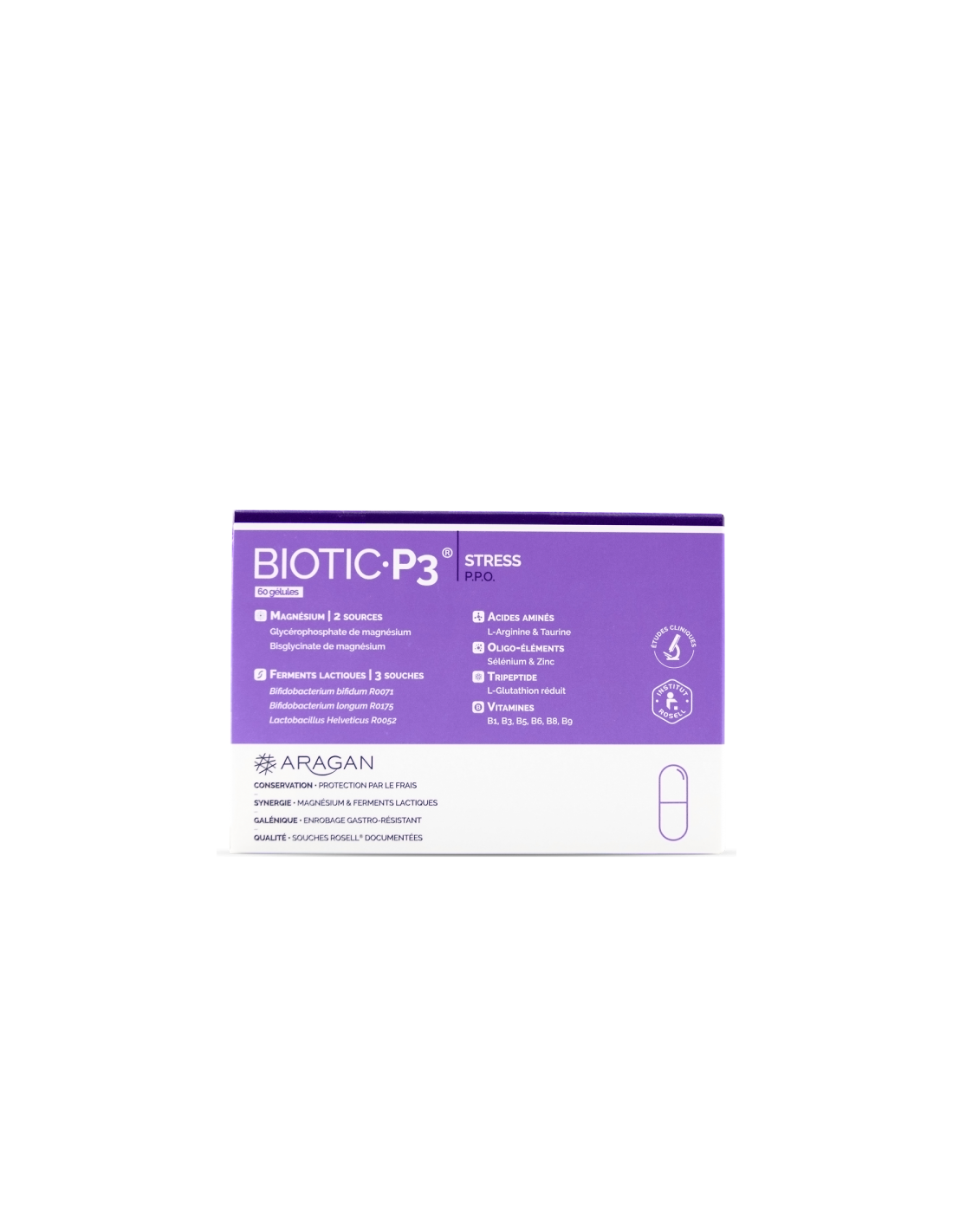 Complément alimentaire pour le stress physique, psychique et oxydatif, associant 6 milliards de ferments lactiques de 3 souches différentes, 2 formes de magnésium (bisglycinate et glycérophosphate), des vitamines, des acides aminés, des oligo-éléments et du L-Gluthation. Ne pas dépasser la dose journalière recommandée. À conserver de préférence au frais. Tenir hors de portée des jeunes enfants. Ce complément alimentaire ne se substitue pas à une alimentation variée et équilibrée ni à un mode de vie sain. Les personnes sous contrôle médical doivent demander conseil à leur pharmacien ou à leur médecin. Ne convient pas aux personnes allergiques à l’un des constituants.