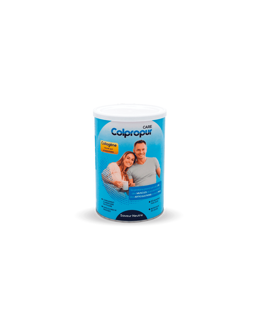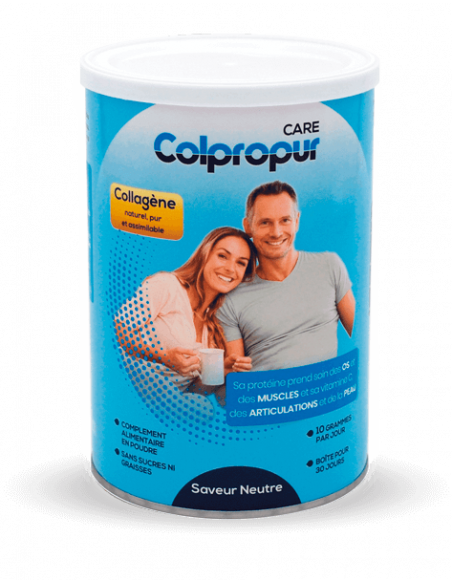Complément alimentaire pour la santé des articulations, des os et de la peau COLPROPUR Care Neutre Collagène est un complément alimentaire sous forme de poudre. Il a été spécifiquement formulé pour contribuer au bien-être des articulations et des os. Il convient à celles et ceux qui veulent rester en bonne santé de façon naturelle et efficace. COLPROPUR Care Neutre Collagène est également adapté aux personnes qui souhaitent préserver leur bien-être musculaire. En plus d'aider à maintenir la masse musculaire, il contribue au bon fonctionnement des muscles. Il participe enfin au maintien de la bonne santé des gencives et des dents. Complément alimentaire à base de collagène et vitamine C COLPROPUR Care Neutre Collagène associe protéine collagène hydrolyséeet vitamine C. Le collagène renforce la cohésion cellulaire tandis que la vitamine C booste les défenses naturelles et neutralise les radicaux libres. L'action combinée de ces ingrédients garantit des résultats visibles dès 1 à 3 mois après la première prise.