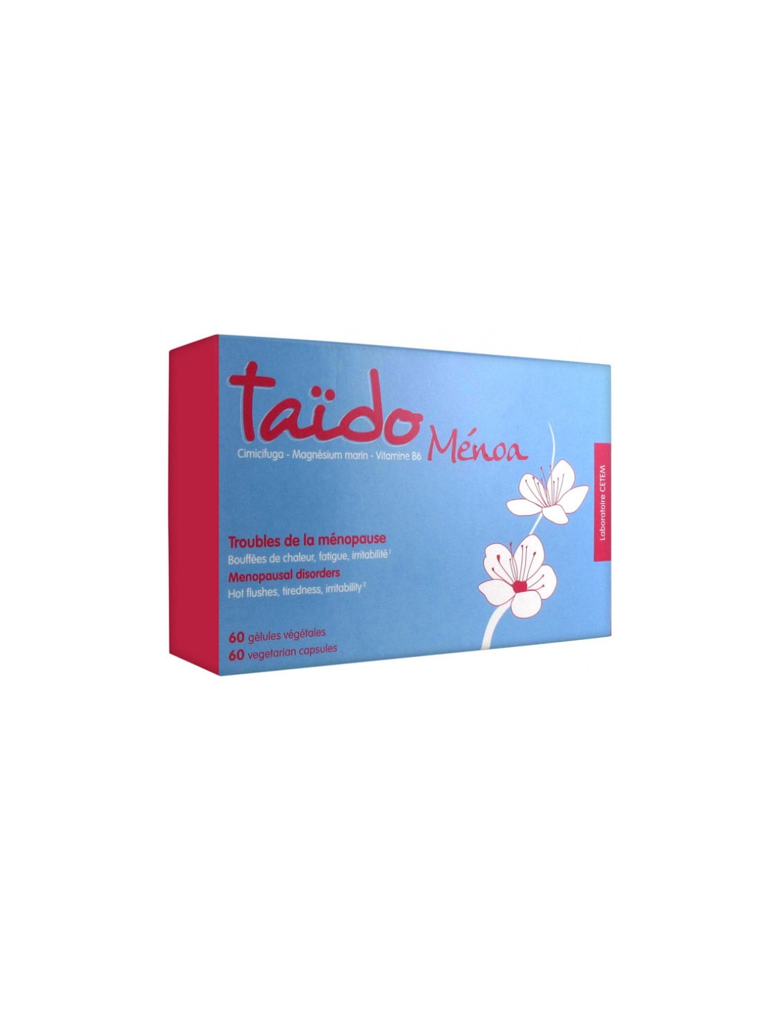 Taïdo Ménoa Troubles de la Ménopause 60 Gélules Végétales est un complément alimentaire sous forme de gélule végétale à base de Cimicifuga, de Magnésium Marin et de Vitamine B6. Ce complément alimentaire contient du Cimicifuga qui aide les femmes à supporter les signes révélateurs associés à la ménopause, tels que les bouffées de chaleurs, la sudation, la nervosité et l'irritabilité.