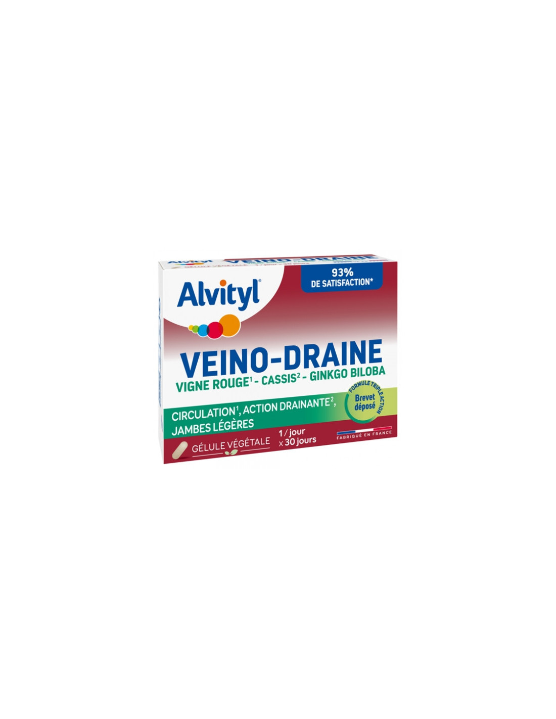 Alvityl Veino-Draine 30 Gélules est un complément alimentaire triple action à base de nutriments et de plantes, conçu pour une action drainante, pour favoriser la circulation et pour des jambes légères. Sa formule associe 2 vitamines à 2010 mg d'actifs en équivalent plante et agit grâce à : la vigne rouge qui aide à la circulation veineuse pour des jambes légères, le cassis qui a une action drainante et favorise l'élimination rénale de l'eau, le citrus (riche en bioflavonoïdes naturels) qui est associé au ginkgo et à la vitamine C, reconnue pour contribuer à la formation du collagène et assurer le bon fonctionnement des vaisseaux sanguins.