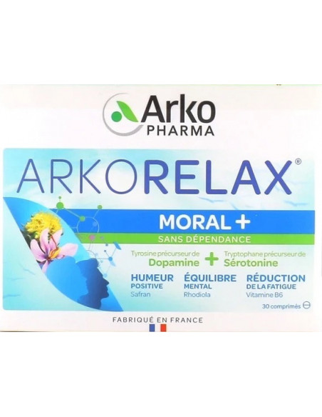 Destiné aux personnes qui souhaitent agir contre une baisse de moral passagère, un manque d'énergie ou un déséquilibre émotionnel, Arkorelax Moral+ allie une action dopaminergique et une action sérotoninergique. D'une part, l'association de tyrosine (précurseur de dopamine), vitamine B6 et rhodiola contribue à augmenter la synthèse de dopamine, molécule du bonheur, et à réduire sa dégradation. D'autre part, le tryptophane (précurseur de dopamine), la vitamine B6 et le safran vont contribuer à augmenter la synthèse de sérotonine, également associée au bonheur, et à prolonger son effet par inhibition de recapture.