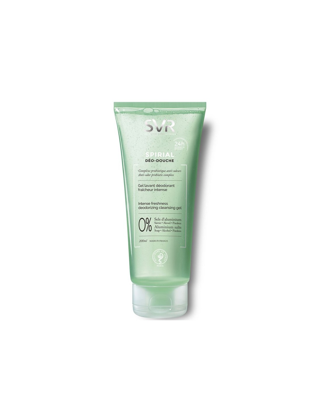 SVR crée SPIRIAL Déo-douche, le 1er* gel lavant déodorant fraicheur intense à l’efficacité 24 heures**. Il assainit la peau et laisse une sensation de propre toute la journée. Les agents anti-bactériens contenus dans son complexe probiotique luttent contre les odeurs corporelles tout en maintenant l'équilibre de la flore cutanée. Formulé au pH physiologique, sans savon, sans alcool et sans sels d’aluminium, il est adapté aux peaux sensibles.