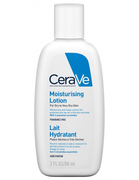 CeraVe Lait Hydratant 88 ml est un soin indiqué pour les peaux sèches à très sèches. Il nourrit, hydrate et aide à restaurer la barrière protectrice de la peau. Sa texture est légère et non grasse et enrichie aux 3 céramides essentiels et à l'acide hyaluronique.