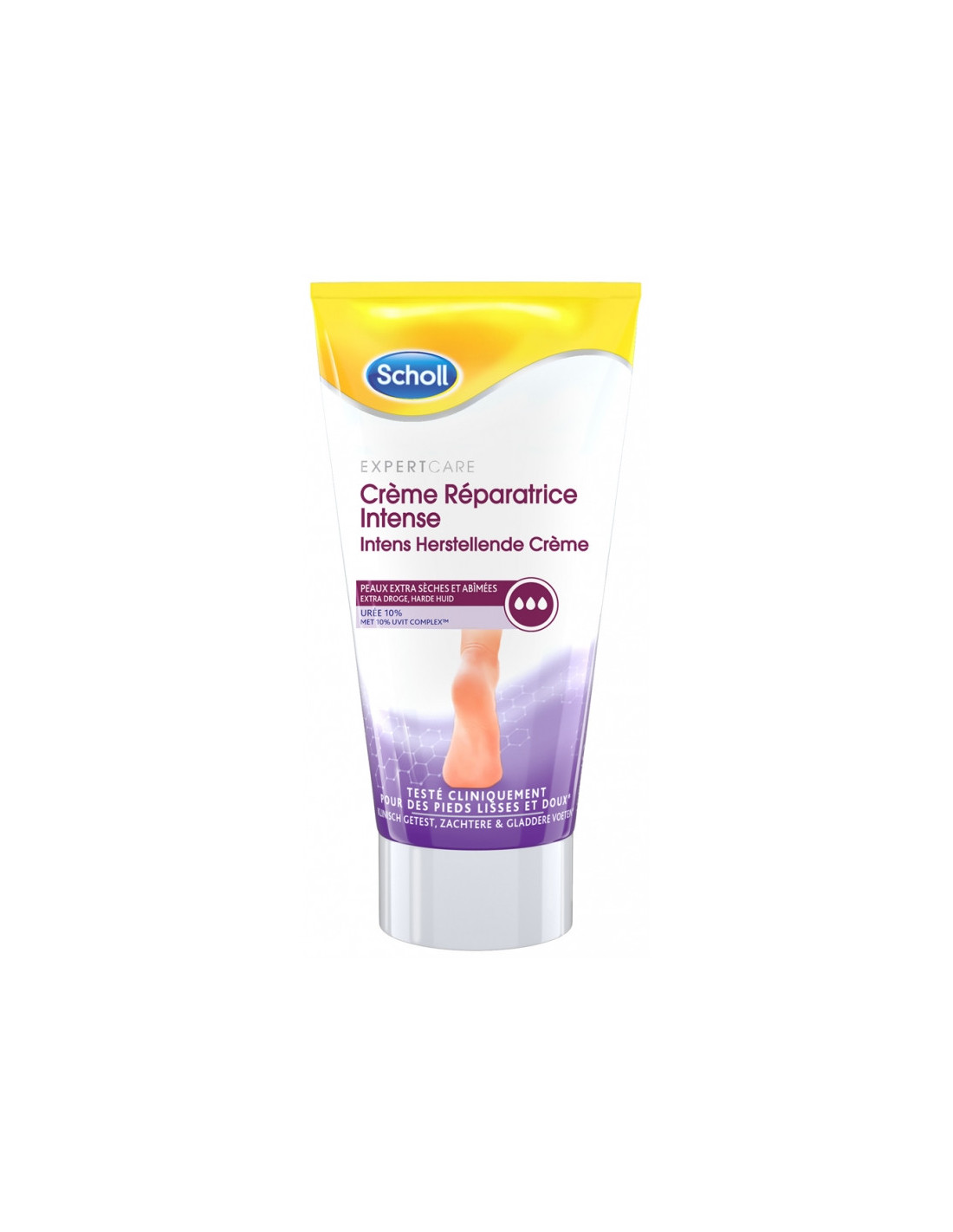 Scholl Crème Réparatrice Intense 150 ml est une crème qui a été développée spécialement pour la peau de vos pieds. Formulée avec 10% d'urée et un complexe de vitamines B5, la crème réparatrice intense permet une hydratation ciblée de l'épiderme. Dès la première utilisation, la peau abîmée est apaisée et très hydratée. L'apparence craquelée de la peau des pieds est diminuée. Après plusieurs utilisations, la crème aide à réparer la barrière cutanée naturelle et à prévenir l'accumulation de peau dure grâce à une utilisation régulière.