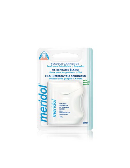 Méridol Fil Dentaire Élargi 40 m goût menthe permet un nettoyage doux pour les gencives.