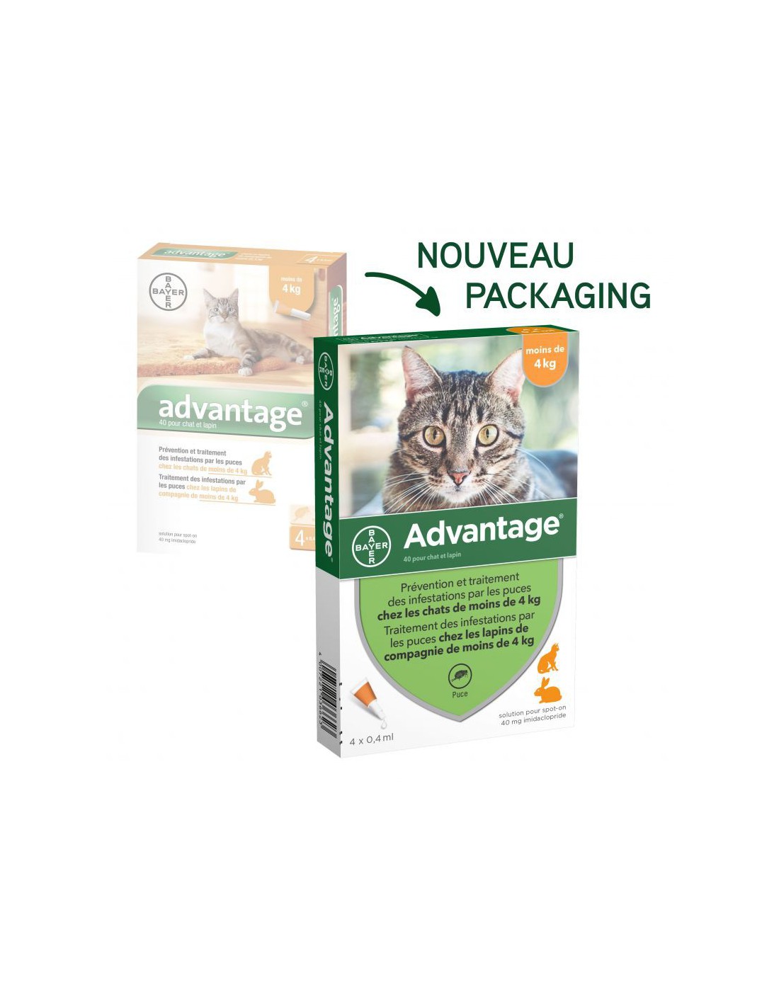 Advantage® 40 pour chat est un médicament sous forme de pipettes qui s'utilisent par application cutanée sur les chats de moins de 4 kg à partir de l'âge de 8 semaines en prévention ou en traitement des infestations de puces et chez les lapins de compagnie de moins de 4 kg en traitement des infestations de puces. Un seul traitement prévient les réinfestations par les puces pendant 3 à 4 semaines et jusqu'à une semaine chez les lapins. ATTENTION NE PAS UTILISER CHEZ LES AUTRES RONGEURS ET NAC.
