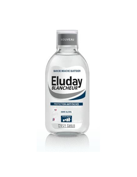 ELUDAY BLANCHEUR est un bain de bouche à usage quotidien à utiliser après chaque brossage pour des dents renforcées et éclatantes. Il permet de limiter la fixation des agents colorants sur la surface des dents, de limiter la formation de la plaque dentaire, le tout sans alcool ! Son arôme mentholé apporte une sensation de bouche propre et saine.