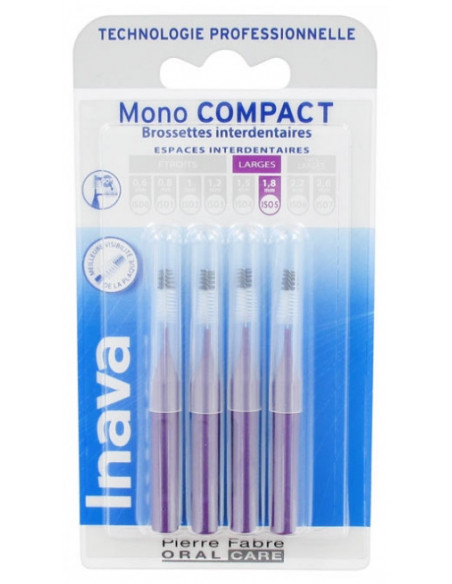 Inava Mono Compact 4 Brossettes Interdentaires - Taille : ISO5 1,8 mm sont conçues pour éliminer efficacement la plaque dentaire déposée entre les dents. Sa tige flexible jusqu'à 90°C et résistante permet un meilleur accès aux zones difficiles et une facilité d'insertion par la face linguale. Les brins sont bicolores (blancs pour révéler les gencives sensibles en cas de saignement, noirs pour une meilleure visibilité lors de l'élimination de la plaque dentaire).