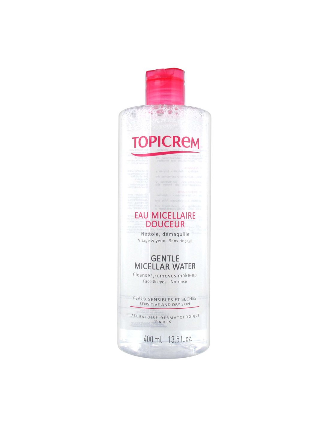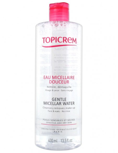 Topicrem Eau Micellaire Douceur 400 ml nettoie et démaquille en douceur les peaux sensibles de toute la famille, laissant la peau propre et douce.