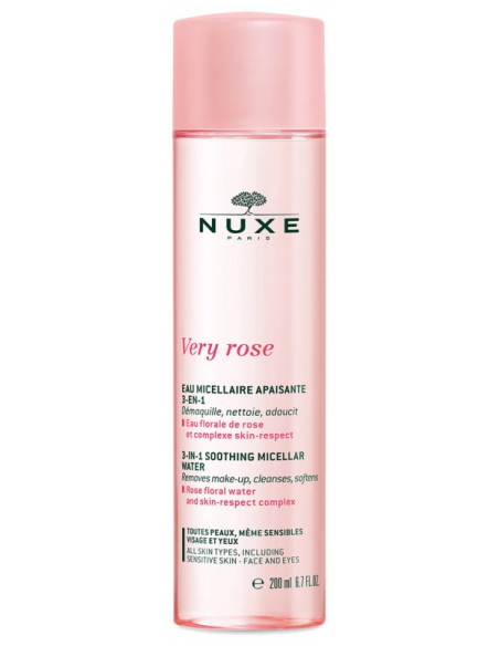 Nuxe Very rose Eau Micellaire Apaisante 3en1 200 ml est une eau micellaire sans rinçage à l'eau florale de rose qui démaquille, nettoie et adoucit tous types de peaux.