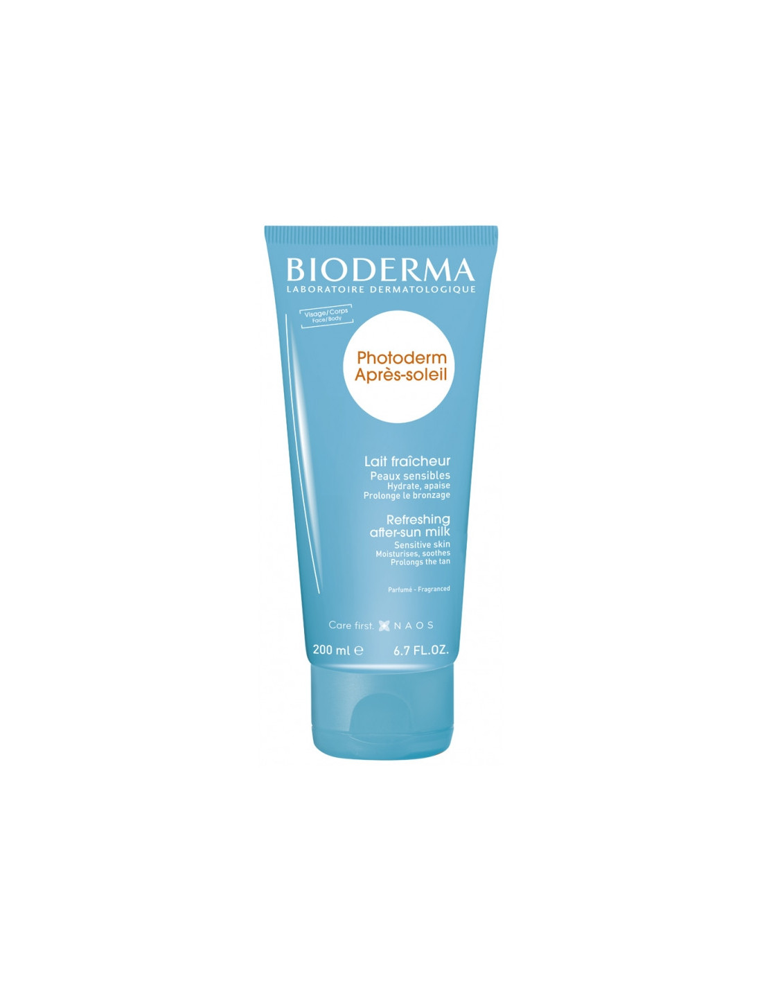 Bioderma Photoderm Après-Soleil Lait Fraîcheur 200 ml visage et corps convient aux peaux sensibles, peaux déshydratées et apaise les coups de soleil.