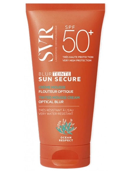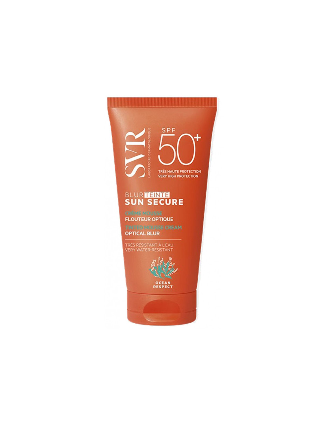 SVR Sun Secure Blur Crème Mousse Flouteur Optique SPF50+ Teinté 50 ml est une très haute protection solaire au délicat parfum d'été. Sa texture mousse teintée est inédite, elle fond instantanément pour flouter les défauts et unifier la peau visiblement. Sa légère teinte hâlée réhausse, unifie et illumine le teint pour un effet bonne mine naturel et un fini incroyablement velouté. Le brevet Sun Secure est une sélection exclusive de 4 filtres non écotoxiques associée à des actifs protecteurs pour cibler les rayons UVB + UVA + Visible + Infrarouges.