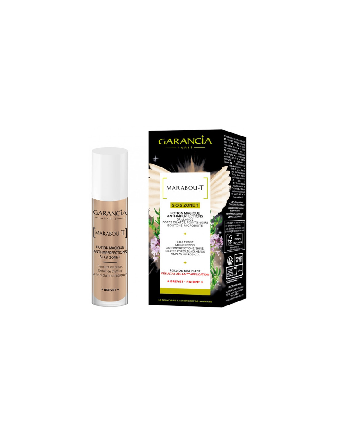 Garancia Marabou-T S.O.S Zone T Roll-On Matifiant 10 ml est un soin visage spécialement conçu pour la zone T, pour lutter contre les pores dilatés, impuretés blanches et points noirs. Au cœur de la formule de cette potion magique, le complexe T-PURE, un concentré d'actifs aux super pouvoirs, associant : des prébiotiques qui aident à équilibrer la microflore, un ferment de boue qui aide à diminuer les marques d'imperfections et les impuretés blanches logées dans les pores dès 14 jours, de l'acide succinique exfoliant, un actif breveté issu des cellules souches végétales de marrube blanc qui aide à diminuer les points noirs et l'impact de la pollution sur la peau, des poudres d'algues fossilisées qui absorbent le sébum. La formule est complétée par 8 extraits botaniques pour visiblement réduire les imperfections, boutons, points noirs, pores dilatés et matifier la peau. La peau est immédiatement matifiée, après 1 jours, elle apparaît moins grasse, les pores resserrés, les impuretés, toxines, points noirs sont éliminés.
