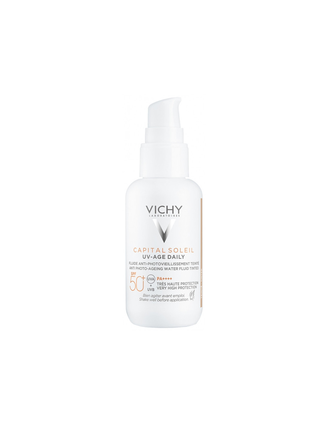 Vichy Capital Soleil UV-Age Daily Fluide Anti-Photovieillissement Teinté SPF50+ 40 ml est un fluide enrichi en Eau Volcanique de Vichy. Il se compose de fractions de probiotiques, de Peptides et de Niacinamide. Grâce à sa technologie Netlock brevetée, son film fin protège des filtres à large spectre et offre un fini ultra-léger qui le rend imperceptible, et non gras. Il aide à prévenir les rides, les taches et le stress oxydatif induits par les UV + la pollution. Il corrige les taches et la perte de rebond. Il unifie le teint avec une couvrance naturelle.