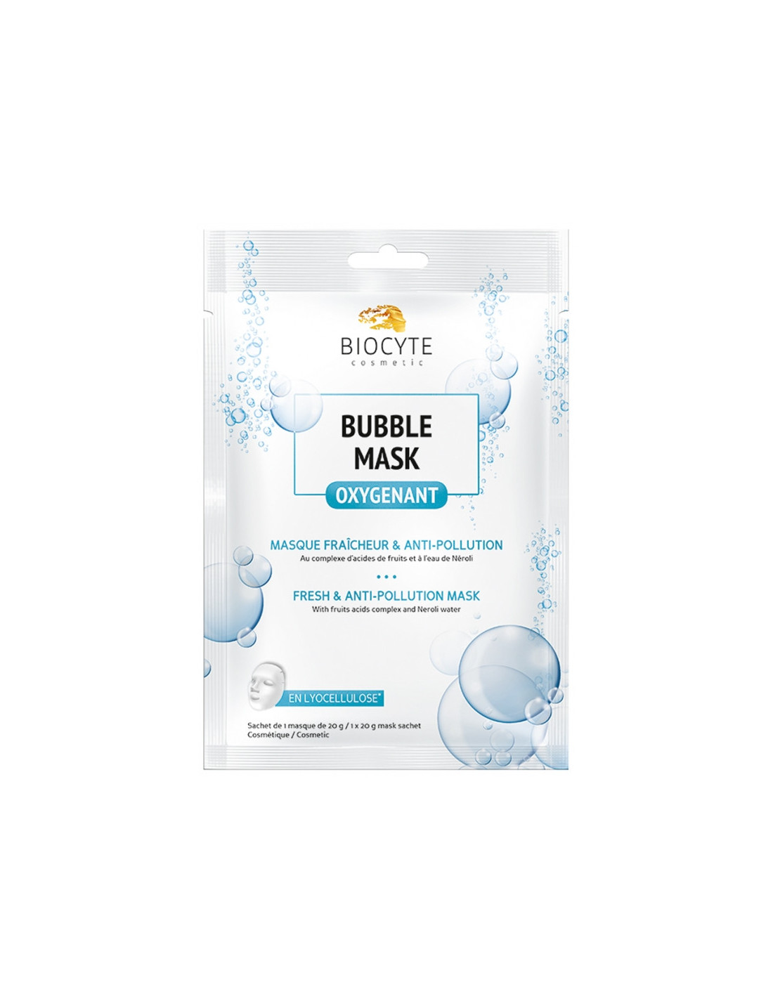 Biocyte Bubble Mask Oxygénant 20 g est un masque fraîcheur & anti-pollution au complexe d'acides de fruits et à l'eau de Néroli. Conçu pour oxygéner et purifier le visage, ce masque en lyocellulose contient une mousse rafraîchissante qui apporte une sensation instantanée de bien-être. Sa formule exclusive aux acides de fruits exfolie et assainit la peau pour un effet anti-pollution. L'eau de Néroli apaise et soulage de la sensation d'inconfort. La peau est purifiée en profondeur, éclatante de pureté. C'est un véritable soin de fraîcheur et douceur pour la peau.